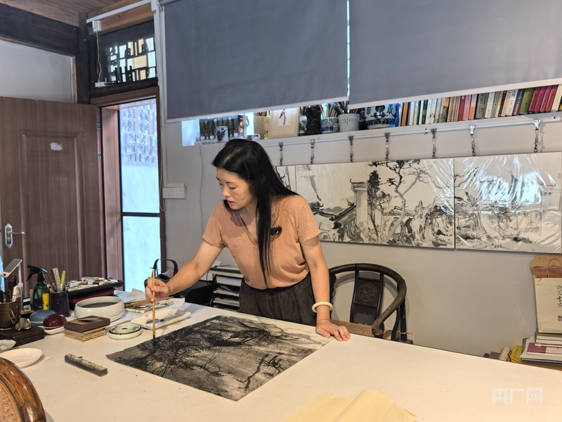 在古城临街巷的冰花工作室,画家冰花正在用画笔捕捉着古城的时空变幻:既有“青山一道同云雨”的诗意想象,也有“歪歪扭扭老屋”的现实肌理。“这些景是浑然天成的,一张画面的形成往往是偶然的,并非刻意”。她说,通过融合不同时代的建筑元素,折射出黔阳古城兼容并蓄的文化品格。