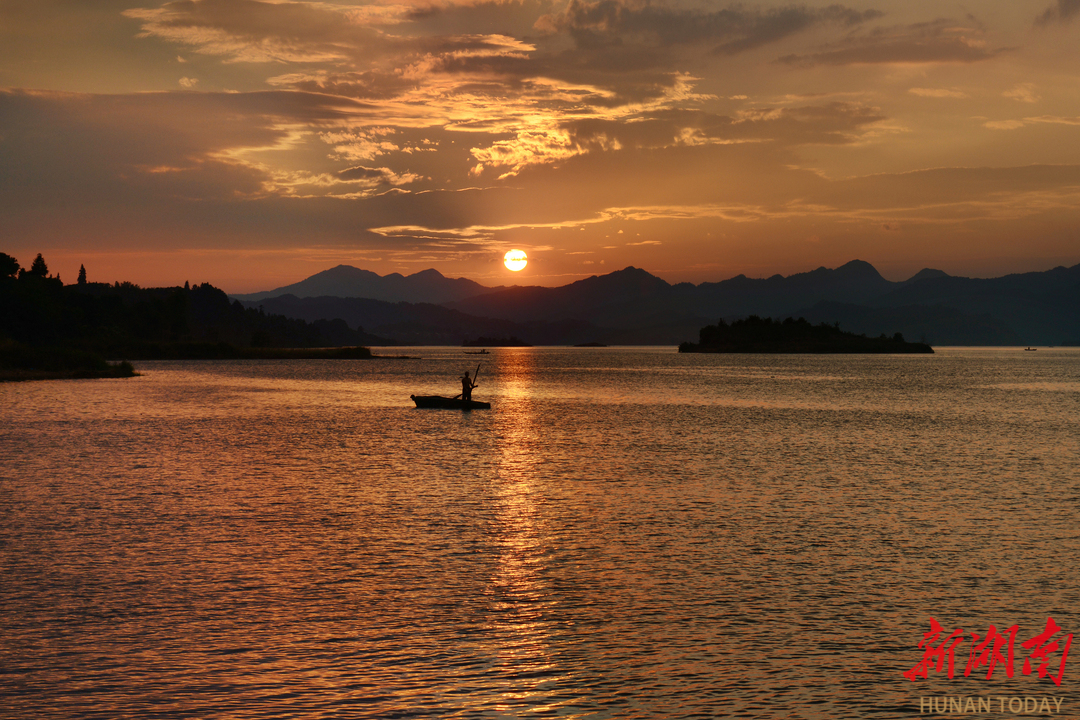 日落时分,霞烧长空,夕照与山影同浮沉,造就了清江湖的绝美风景“清江晚映”。杨锡建 摄